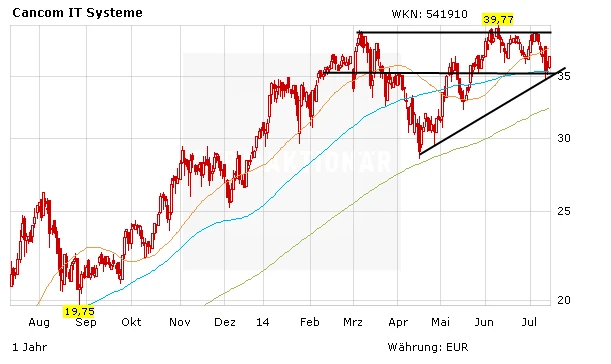 Der 450-Punkte-Rutsch im DAX machte auch vor der Cancom-Aktie nicht Halt. Ergebnis: Das Papier rutschte am Freitag bis auf rund 35 Euro ab. DER AKTIONÄR wies einmal mehr darauf hin, dass schwache Tage bei der Cancom-Aktie in der Vergangenheit immer wieder gute Einstiegsgelegenheiten ergaben.