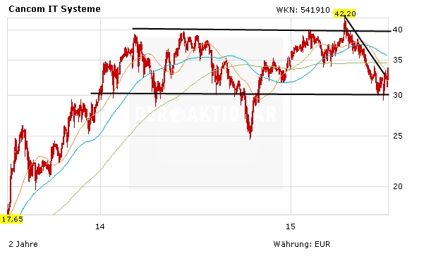 Der TecDax-Konzern sei hervorragend positioniert für künftiges Wachstum. Er sehe deutliches Potenzial für die Aktie. Auch die Privatbank Hauck & Aufhäuser hat die Einstufung für Cancom nach einer Investorenveranstaltung auf "Buy" mit einem Kursziel von 45,50 Euro belassen. Kurzfristig dürften negative Nachrichten wegen Investitionsaufschüben und dem US-Dollar-Schock die Aktie belasten, der fundamentale Anlagehintergrund sei aber nach wie vor intakt, schrieb Analyst Tim Wunderlich. Die aktuelle Verlagerung hin zum Cloud Computing sollte die Berechenbarkeit, die Margen und die Gewinne des IT-Dienstleisters stärken. Am Dienstag legt die Baader Bank mit einer Kaufempfehlung für Cancom nach, Kursziel 39 Euro.