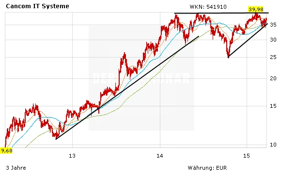 Zuletzt riet DER AKTIONÄR bezüglich der Cancom-Aktie immer wieder zum Einstieg. In der Vergangenheit hat es sich immer wieder bewährt, das Papier an schwachen Tagen einzusammeln. Dennoch: die Relative Schwäche gegenüber dem Gesamtmarkt stimmt nachdenklich. Die Aktie ist derzeit nur eine Halteposition. Neue Käufe drängen sich erst wieder auf, wenn Cancom aus der langen Seitwärtsrange nach oben ausbricht. Heißt: erst wenn die Marke von 39,98 Euro fällt, greifen Anleger zu.
