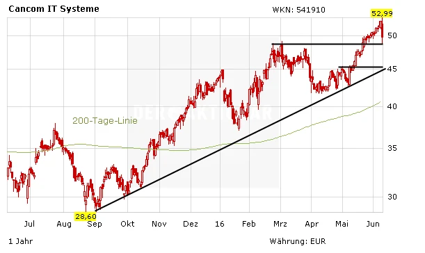 Vor dem heutigen Handelstag wies die Cancom-Aktie seit Jahresbeginn eine Performance von mehr als 18 Prozent auf. Dieses Plus ist nunmehr auf knapp 14 Prozent geschrumpft. Vor der Hauptversammlung am kommenden Dienstag scheinen einige Anleger ihre Gewinne vom Tisch zu nehmen.