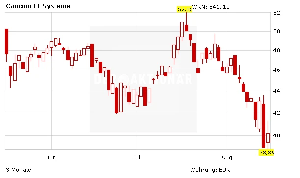 Die Cancom-Aktie gab am frühen Nachmittag nach dem Erreichen des Tageshochs von rund 41 Euro prompt nach und liegt aktuell mit knapp 40 Euro leicht über dem Vortagesschluss – trotz der negativen Kommentare und dem tiefroten Gesamtmarkt. Interessierte Anleger warten klare Kaufsignale ab.