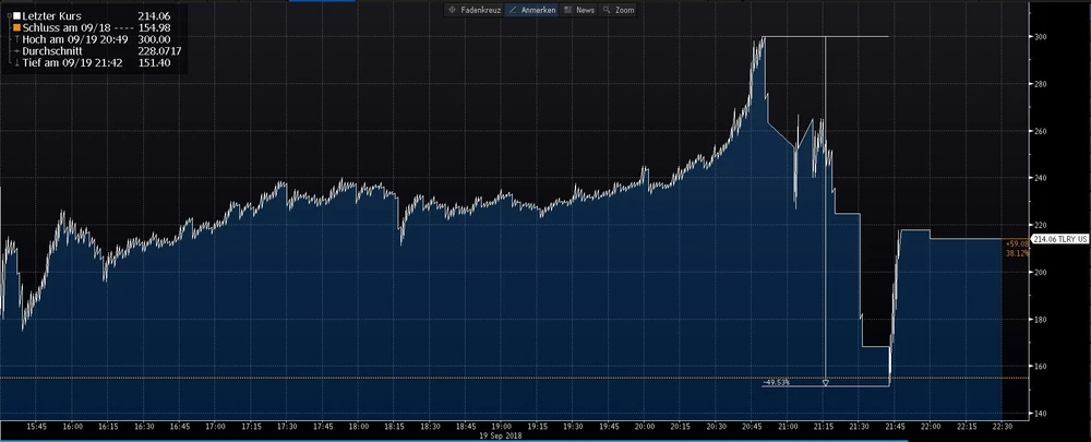 Die Tilray-Aktie hat sich längst zum Spielball für Zocker und Shortseller entwickelt. Tilray notierte bereits vor der Börseneröffnung in den USA rund 40 Prozent im Plus. Doch damit nicht genug: Im Laufe des Handels schoss die Aktie in der Spitze auf exakt 300 Dollar nach oben, um in Anschluss binnen kurzer Zeit erneut um 50 Prozent intraday wieder einzubrechen. Die hohe Volatilität brachte die Handelsplätze zeitweise an ihre Grenzen. Fünf Mal musste die Tilray-Aktie ausgesetzt werden, der Tages-Chart spricht Bände. Bedingt wird diese extreme Kursentwicklung durch einen geringen Freefloat und hohe Shortpositionen, unter anderem von Citron Research.