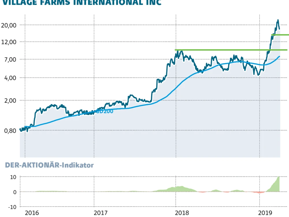 DER AKTIONÄR hatte in den letzten Tagen ein erstes Kauflimit bei 20,10 kanadische Dollar platziert. Das zweite Limit liegt noch bei der Ausbruchslinie bei 16,20 kanadischen Dollar im Markt. Auch das dritte Abstauberlimit bei 14,15 kanadische Dollar bleibt bestehen. Auch wenn die Konsolidierung ziemlich schnell abläuft. Langfristig ist und bleibt das positive Szenario für Village Farms intakt.