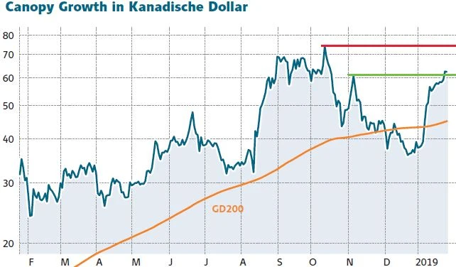Welch ein beeindruckender Jahresstart: Die Aktie von Canopy Growth hat im laufenden Jahr bereits mehr als 70 Prozent zulegen können. Mit dem heutigen Kurssprung von fast vier Prozent auf zuletzt 61,33 Kanadische Dollar hat die Aktie das Novemberhoch 2018 übertroffen und damit ein neues Kaufsignal generiert. Damit rückt das Allzeithoch, das Mitte Oktober bei 76,68 Kanadische Dollar markiert wurde, bereits wieder in greifbare Nähe. Doch was war der Grund für den heutigen Kurssprung? Zum einen ganz klar die Kaufempfehlung durch Piper Jaffray, zum anderen die allgemein gute Stimmung am Markt. Die Analysten von Piper Jaffray haben das Kursziel für die Aktie von Canopy gleichzeitig von 40 auf 60 US-Dollar (aktueller Kurs: 46,39 US-Dollar) angehoben. Sie sehen das kanadische Cannabis-Unternehmen für weiteres Wachstum gut positioniert. Sie sehen großes Potenzial auf vielen Ebenen.