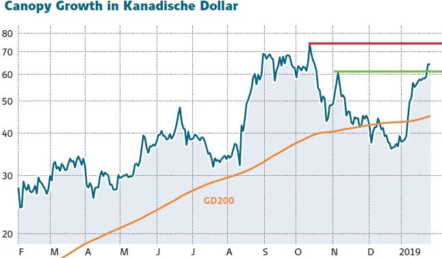 Was für eine Rallye bei Canopy Growth. Seit dem Zwischentief im Dezember 2018 bei 34,36 Kanadische Dollar klettert das Papier nahezu ohne Pause nach oben. Allein am Freitag gewann das Papier 8,6 Prozent auf 64,10 Kanadische Dollar. Damit erreichte die Aktie ein neues 3-Monats-Hoch. Nur im Oktober 2018 im Zuge der vollständigen Freigabe von Cannabis in Kanada stand Canopy Growth noch höher. Damals markierte die Aktie bei 76,68 Kanadischen Dollar ihr vorläufiges Allzeithoch. Von dieser Bestmarke ist Canopy mittlerweile nur noch rund 20 Prozent entfernt. Eine derartige Kursrallye ist bemerkenswert, ist Canopy doch gemessen an der Marktkapitalisierung (aktuell 8,86 Milliarden Kanadische Dollar) immerhin der die Nummer 1 unter den Cannabis-Playern.
