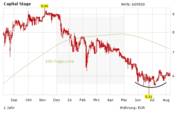 Zuletzt gelang der Aktie die langersehnte Bodenbildung im Bereich von sechs Euro. Die Aktie hat vom Allzeithoch im November 2015 in der Spitze um 35 Prozent korrigiert und steht kurz vor einem Trendwechsel. Mit Spannung erwarten die Anleger Ende August Halbjahreszahlen von Capital Stage. Bei einer erfolgreichen Übernahme der Chorus-Gruppe rückt außerdem der mögliche Indexaufstieg in den Fokus der Anleger.