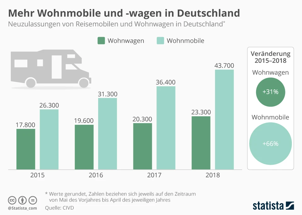 Grund dafür ist ein regelrechter Aufschwung, den die Branche seit einiger Zeit erlebt. So stiegen allein in Deutschland die Verkäufe von Wohnmobilen um 66 Prozent in den vergangen drei Jahren. In Europa werden derzeit rund 185.000 Reisemobile und Wohnwagen jedes Jahr zugelassen – im Jahr 2022 sollen es, laut Caravaning Industrie Verband, schon 245.000 sein.