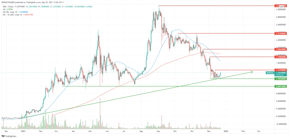 Anfang September markierte ADA noch ein Allzeithoch bei 3,10 Dollar. Die anschließende Korrektur zieht sich bis heute und der Kursabschlag zum Rekordstand beläuft sich mittlerweile auf über 56 Prozent. Damit notiert ADA wieder in der Range aus dem Frühjahr die sich zwischen 1,00 bis 1,50 Dollar aufspannt.