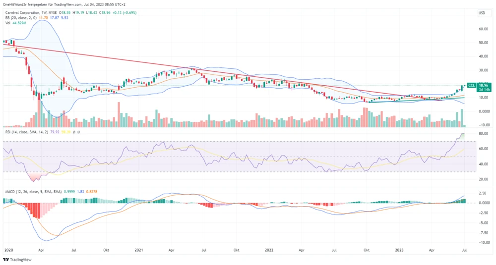 Durch die steilen Kursgewinne der letzten Wochen und Monate sind Carnival drei Meilensteine gelungen. Erstens konnte das Papier einen mittelfristigen Aufwärtstrend etablieren, dieser führte zweitens zum Überwinden der langjährigen Abwärtstrendlinie, dem drittens eine deutliche Rallybeschleunigung insbesondere im letzten Monat folgte: