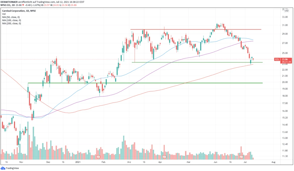Das Kreuzfahrt-Unternehmen Carnival hat es zuletzt nicht besonders leicht gehabt. Die Sorge vor der Delta-Variante sowie enttäuschende Zahlen haben den Anteilscheinen massiv zugesetzt. Seit Anfang Juni ist die Aktie daher auf Talfahrt. Damit steht sie jetzt aus charttechnischer Sicht an einer wichtigen Marke. Darauf ist nun zu achten.