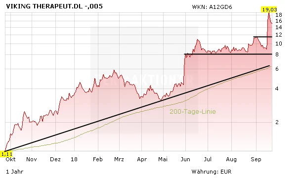 Nach der Kursexplosion musste die Viking-Aktie Federn lassen. Denn zwei Tage nach der Publizierung der Daten nutzte die Biotech-Gesellschaft das erhöhte Kursniveau, um frisches Kapital einzusammeln. Insgesamt platzierte Viking Therapeutics 9,5 Millionen Aktien zum Kurs von 18,50 Dollar. Mit dem Geld wollen die Amerikaner die Entwicklung von VK2809, VK5211 und VK0214 vorantreiben.