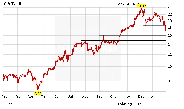 Schuld an der schwachen Performance waren aber keineswegs schlechte Unternehmensmeldungen, die Entwicklung war erster Linie Gewinnmitnahmen in einem nervösen Marktumfeld geschuldet. C.A.T. Oil leidet jedoch auch unter der Rubelentwicklung und größeren Insiderverkäufen durch Poesia. Allein am heutigen Donnerstag verliert die Aktie mehr als acht Prozent auf 17,24 Euro. Im Zuge der Korrektur ist der Wert auch unter den vom AKTIONÄR empfohlenen Stoppkurs gerutscht und wurde mit einem Gewinn von 108 Prozent verkauft. Aus charttechnischer Sicht könnte sich die Korrektur nun durchaus bis in den Bereich von 15 bis 16 Euro fortsetzen. Anleger können in diesem Bereich versuchen, mit Abstauberlimits wieder zuzukaufen.