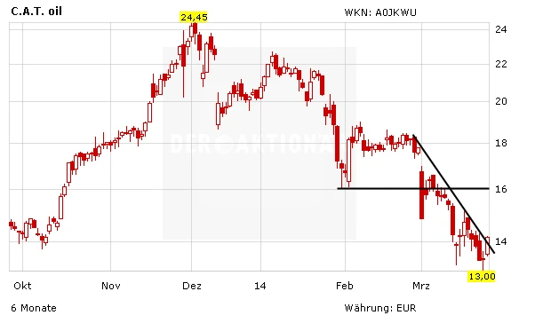 Weitet sich die Krise in der Ukraine nicht weiter aus, dürfte die C.A.T.-Oil-Aktie ihre Aufholjagd forsetzen. Erst über der 16-Euro-Marke hellt sich die charttechnische Situation nach dem Absturz der vergangenen Wochen nachhaltig auf. Aktuell eignet sich ein Engagement nur für risikobereite Anleger, die die Aktie mit einem engen Stopp absichern.