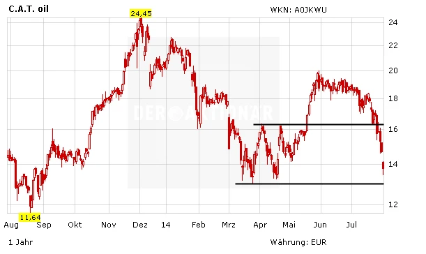 Die Aktie von C.A.T. Oil ist seit Tagen massiv unter Druck. Nun läuft das Papier auf die wichtige Unterstützung bei 13 Euro zu, die es zu verteidigen gilt. Anleger sollten bis zu einer Entspannung der Lage die Entwicklung von C.A.T. Oil vorerst nur von der Seitenlinie aus beobachten.