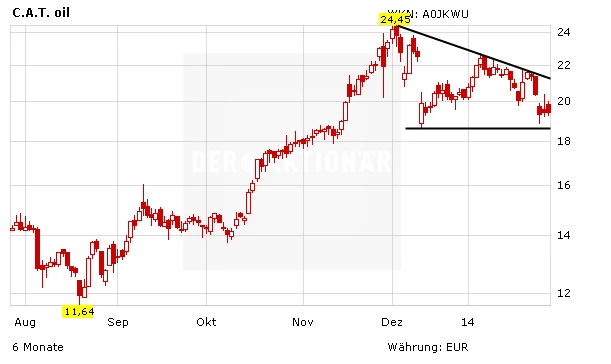 Kein anderes Papier hat sich im vergangenen Jahr im SDAX so gut entwickelt wie die Aktie von C.A.T. Oil. Im Jahresvergleich legte die Aktie rund 200 Prozent zu, die Zweitplatzierte Grammer-Aktie rangiert mit einem Plus von 116 Prozent deutlich dahinter. Anfang Dezember 2013 hat der Titel aber bei 24,45 Euro seinen vorläufigen Hochpunkt gefunden.