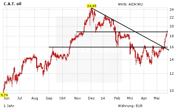 Der Jahresgewinner 2013 im SDAX hatte in den vergangenen Monaten eine deutliche Korrektur erfahren. Der Wert verlor von mehr als 24 Euro auf zwischenzeitlich 13 Euro. Zuletzt konnte sich die C.A.T. Oil-Aktie aber bereits ordentlich bis auf 19 Euro erholen. Damit gelang es dem Titel den seit Dezember ausgebildeten Abwärtstrend und auch den horizontalen Widerstand im Bereich von 16 Euro nach oben zu durchbrechen. Nach Bekanntabe der Zahlen korrigiert der Titel am heutigen Dienstag deutlich. Risikobereite Anleger können den Rücksetzer nutzen und auf eine Fortsetzung der Erholungsbewegung spekulieren.