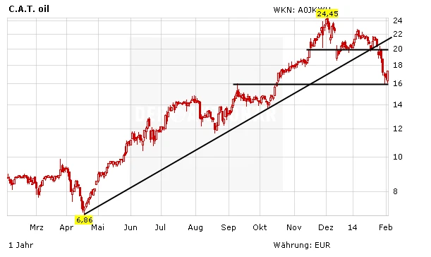 Unter trading-technischen Gesichtspunkten ist C.A.T. Oil durchaus einen Versuch wert. Das erste Kursziel für eine Gegenbewegung liegt bei 20 Euro. Der Stoppkurs sollte bei 15,80 Euro und damit knapp unter der neuen Unterstützung platziert werden.