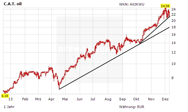 Die Anleger haben naturgemäß wenig begeistert auf die Aktienplatzierung reagiert. Die C.A.T.-Oil-Aktie verlor nach der Bekanntgabe leicht an Wert. Das positive Chartbild ist dennoch intakt. Die mehrmonatigen Aufwärtstrends wurden noch nicht unterschritten. Investierte Anleger sollten sich von der Aktienplatzierung nicht verunsichern und daher weiter ihre Gewinne laufen lassen.