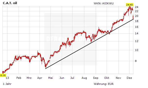 Die Aktienplatzierung der Großaktionärin C.A.T. Holding hatte bei C.A.T. Oil eine Verkaufswelle ausgelöst und den mittelfristigen Aufwärtstrend bedroht. Zwischenzeitlich ist etwas Ruhe eingekehrt, zumal die Analysten wie von HSBC Trinkaus überwiegend positiv eingestellt sind.