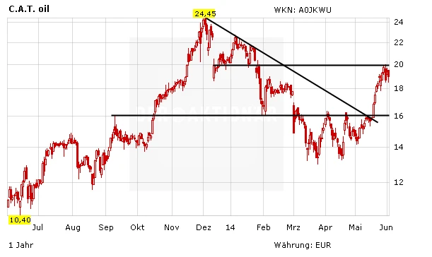Nach dem Ausbruch über den horizontalen Widerstand über die 16-Euro-Marke und der anschließenden Rallye bis zu der charttechnischen Hürde bei 20 Euro ist der C.A.T.-Oil-Aktie zuletzt die Puste ausgegangen. Negative Analystenstimmen sorgen für zusätzliche Unsicherheit unter den Marktteilnehmern.