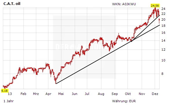 Auch die Commerzbank lässt sich vom Kurssturz nicht beunruhigen. Sie stuft C.A.T. Oil weiter auf "Add" mit einem Kursziel von 26 Euro. Auch Commerzbank-Analyst Dennis Schmitt weist darauf hin, dass der Schritt bereits seit längerem diskutiert und längerfristig positiv sei. Zudem wolle die Holding langfristig an Bord bleiben. Es habe keine Anzeichen gegeben, dass zusätzliche Anteile verkauft werden sollen.