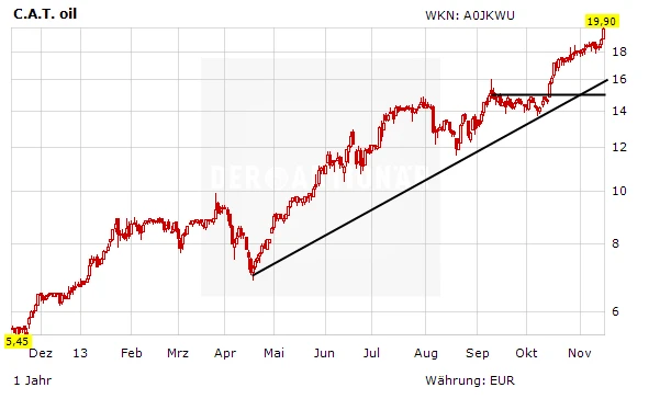 C.A.T. Oil zählt im Moment zu den trendstärksten Aktien auf dem deutschen Kurszettel. Das Plus auf Jahressicht beträgt über 200 Prozent. Alleine in den vergangen drei Monaten hat die SDAX-Aktie über 50 Prozent an Wert zugelegt.