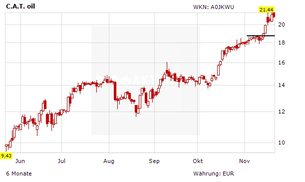 Zuletzt hatte C.A.T. Oil bekannt gegeben, für 2014 bis 2016 ein großes Investitionsprogramm in Höhe von 390 Millionen Euro starten zu wollen. Davon werden 300 Millionen Euro in den Aufbau neuer Kapazitäten und 90 Millionen Euro in Wartung und Instandhaltung fließen. Auch wenn die Aktie am Donnerstag um rund ein Prozent verliert, notiert sie nach wie vor über der psychologisch wichtigen Marke von 20 Euro. Anleger lassen ihre Gewinne von mittlerweile mehr als 140 Prozent weiter laufen, sichern sich aber mit einem Stopp bei 14,80 Euro nach unten ab.