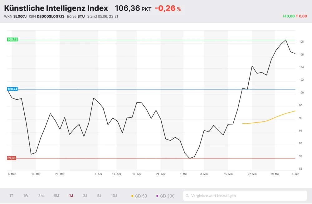 Schrödinger und BioXcel sind zwei amerikanische Biotechnologie-Unternehmen, die neben den großen Playern wie Nvidia, Microsoft und Alphabet Mitglieder des 15 Werte umfassenden DER AKTIONÄR künstliche Intelligenz sind. Mit dem Indexzertifikat WKN DA0ABW können Anleger nahezu eins zu eins an der Entwicklung des Index teilhaben.