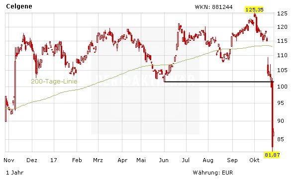 Unfassbar: Seit Anfang Oktober hat Celgene 35 Milliarden Dollar an Börsenbewertung verloren. Die Gründe für den Absturz sind vielseitig. Zum einen haben sich alle großen Biotech-Firmen im Rahmen der Berichtssaison nicht gerade mit Ruhm bekleckert. Auf der anderen Seite hat Celgene mit dem Flop bei Mongersen und dem gekappten Ausblick für das Jahr 2020 sowohl Anleger als auch Analysten kalt erwischt.