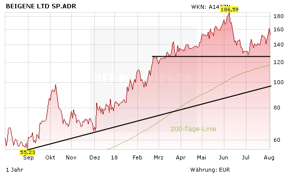 Die schwache Performance der China-Aktien hat auch die einheimischen Pharma- und Biotech-Aktien belastet. Dennoch bleibt das Thema ein absoluter Trendsetter im Reich der Mitte. BeiGene hat den nächsten Schritt gemacht, um auch in China für Investoren interessanter zu werden. Spekulative Anleger nutzen den Kursrücksetzer zum Einstieg, der langfristige Aufwärtstrend und die Investmentstory ist beim Celgene-Partner BeiGene unverändert intakt, zumal das Biotech-Unternehmen zuletzt mit vielversprechenden Studiendaten aufwarten konnte.