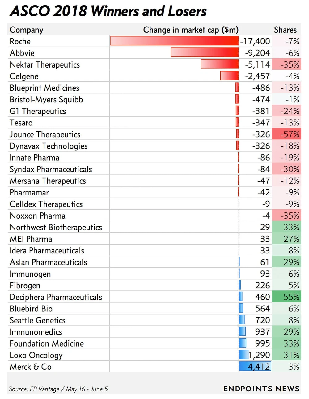 Eine Woche nach dem ASCO Meeting kristallisieren sich die Gewinner und Verlierer des weltgrößten Krebskongresses heraus. Endpoints News hat im Rahmen eines Online-Artikels eine Übersicht der bekanntesten Player erstellt und die Veränderung der Marktkapitalisierung von der Veröffentlichung der ersten "Abstracts" Mitte Mai bis zum 5. Juni. Sowohl auf der Gewinner- als auch Verliererseite finden sich namhafte Unternehmen wieder.