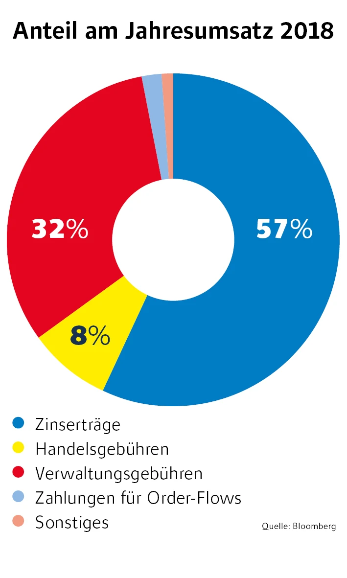 Den Löwenanteil (57 Prozent) des Jahresumsatzes 2018 hat Charles Schwab stattdessen mit Zinserträgen erwirtschaftet. In diese Kategorie fallen die Einnahmen, die mit der kurzfristigen Anlage von Kundengeldern – beispielsweise in US-Staatsanleihen – erzielt werden. Laut Muhamad Said Chahrour, Finanzvorstand des deutschen Brokers Flatex, sind mit kurzfristigen T-Bills positive Renditen von bis zu zwei Prozent pro Jahr möglich.