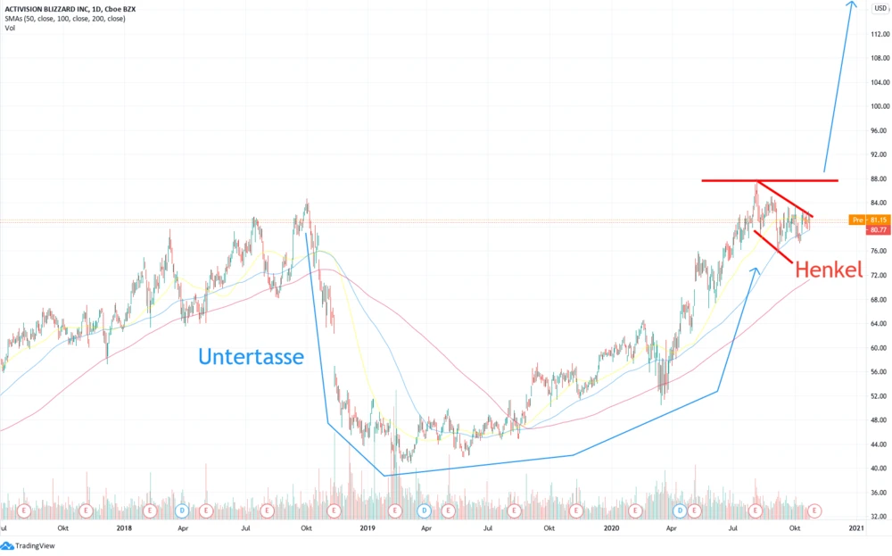 Die Activision-Blizzard-Aktie hat riesiges Potenzial für einen neuen Höhenflug. Der Wert befindet sich aktuell am Ende einer Tassenformation. Diese gilt als eines der stärksten bullishen Chartmuster überhaupt.