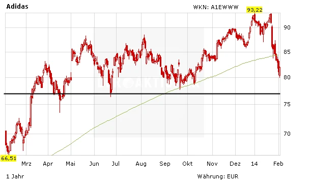 Der gescheiterte Ausbruch über das Allzeithoch am 22. Januar sorgte für enormen Verkaufsdruck bei der Adidas-Aktie. Daraufhin fiel der Kurs unter die psychologisch wichtige 200-Tage-Linie. Eine wichtige Unterstützung findet sich bei 78,00 Euro. Kann die Abwärtsbewegung gestoppt werden und eine Trendwende folgen ist Luft bis 94 Euro.