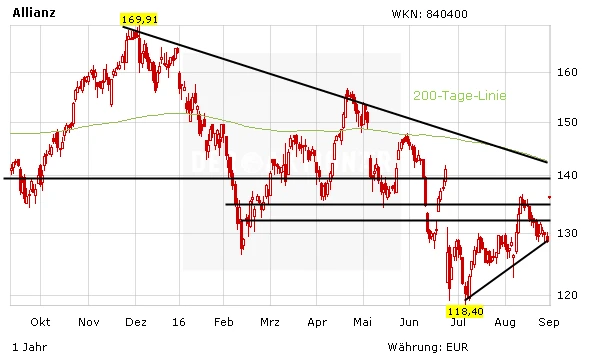 Charttechnisch steht die Allianz-Aktie an einer wichtigen Weggabelung: Der Aufwärtstrend von Anfang Juli ist voll intakt und die massive Unterstützungszone bei 133,86/134,47 Euro sichert nach unten ab. Spielt der Gesamtmarkt mit, könnte der Titel schon bald über den Abwärtstrend bei 137,70 Euro ausbrechen. Dann wäre kurzfristig der Weg bis 140,00 Euro frei. Fundamental ist die Allianz-Aktie mit einem Kurs-Buchwert-Verhältnis von nur 0,9 und einer Dividendenrendite von 5,4 Prozent günstig bewertet. Der Titel ist immer noch ein Kauf. Das Kursziel liegt bei 185,00 Euro. Der Stopp sollte bei 115,00 Euro platziert werden.