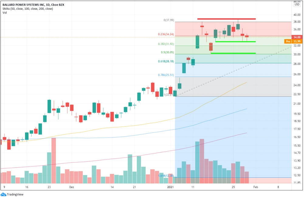 Seit letzter Woche schwankt die Ballard-Power-Aktie in einer Range zwischen 32,80 und 38,00 Dollar. Am Dienstag brach der Wert sogar kurzzeitig aus dem Bereich aus und konnte dabei ein neues Mehrjahreshoch bei 38,68 Dollar markieren. In den vergangenen beiden Handelstagen belastete jedoch der schwache Gesamtmarkt, sodass der Titel unter die Unterstützung am 23,6%-Fibonacci-Retracement bei 34,24 Dollar fiel.