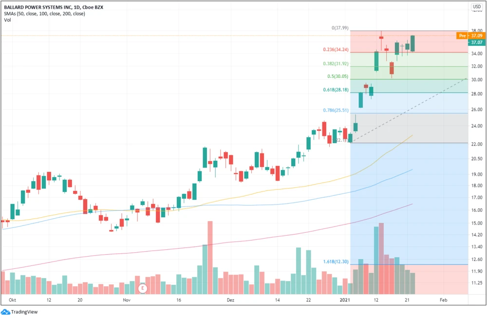 Nachdem die Ballard-Power-Aktie am 13. Januar ein neues Mehrjahreshoch bei 38,00 Dollar markierte hatte, setzte sie in den darauffolgenden zwei Tagen rund 20 Prozent zurück. Knapp über der Unterstützung an der 30-Dollar-Marke kam es letzten Dienstag mit einem starken Kurssprung nach oben zum Rebound.