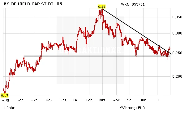 Auch fundamental betrachtet sieht es für die Papiere der Bank of Ireland gut aus. Die irische Volkswirtschaft erholt sich weiter. Der Branchenprimus der grünen Insel spürt dies zum einen durch weiter anziehende Erträge und zum andere durch sinkende Kreditausfälle. In diesem Jahr wird dem Institut endlich der Turnaround gelingen. Es wird ein Überschuss von 338 Millionen Euro erwartet. Im kommenden Jahr dürfte der Gewinn Analystenprognosen zufolge auf 622 Millionen Euro kräftig gesteigert werden.