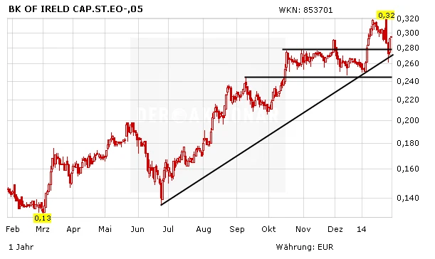 DER AKTIONÄR hält an seiner Kaufempfehlung für die Aktie der Bank of Ireland fest. Die irische Wirtschaft dürfte sich 2014 weiter erholen, wovon der Konzern überproportional profitieren dürfte. Die Titel bleiben für mutige Anleger weiterhin attraktiv, der Stoppkurs sollte bei 0,22 Euro belassen werden.