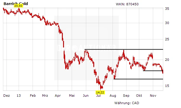 Die Barrick-Aktie hatte Ende Mai und Ende August bei 22,33 Dollar eine Doppel-Spitze ausgebildet. Ende Oktober folgte ein neuer Anlauf, diese Marke zu überwinden, doch scheiterte die Aktie bereits an der 22-Dollar-Marke.