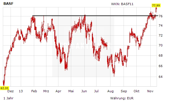 Die BASF-Aktie ist zuletzt über den starken horizontalen Widerstand bei 76 Euro gestiegen. Mit dem Ausbruch wurde gleichzeitig ein neues Mehrjahreshoch markiert. Damit wurde ein Kaufsignal ausgelöst, dass Anschlussgewinne zur Folge haben sollte.