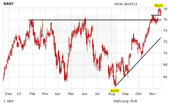 Nachdem sich die BASF-Aktie bereits seit Anfang August in einem Aufwärtstrend befindet, gelang dem Titel zuletzt der Ausbruch über den starken horizontalen Widerstand bei 76 Euro. Mit dem Ausbruch wurde gleichzeitig ein neues Mehrjahreshoch markiert.