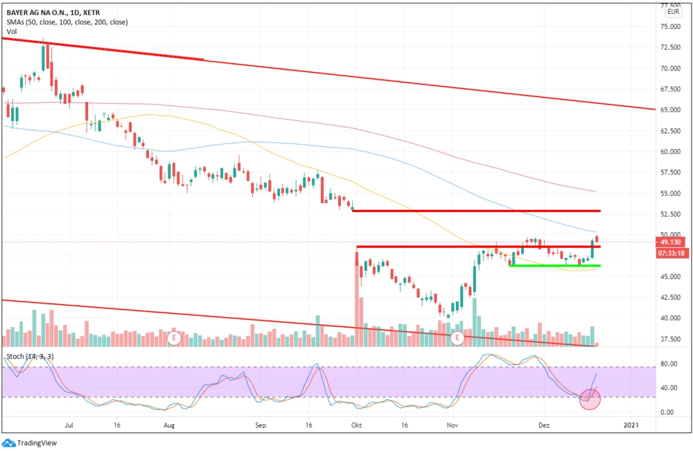 Nach der Konsolidierung Mitte November deutet sich jetzt der lang ersehnte Sprung in das Gap an, welches der Kurs Anfang Oktober zwischen 48,52 und 52,85 Euro aufgerissen hatte. Denn mit einem neuen Kaufsignal beim Stochastik-Indikator (siehe Chart) durchbrach der Kurs am gestrigen Mittwoch den massiven Widerstand an der unteren Gap-Kante bei 48,52 Euro.