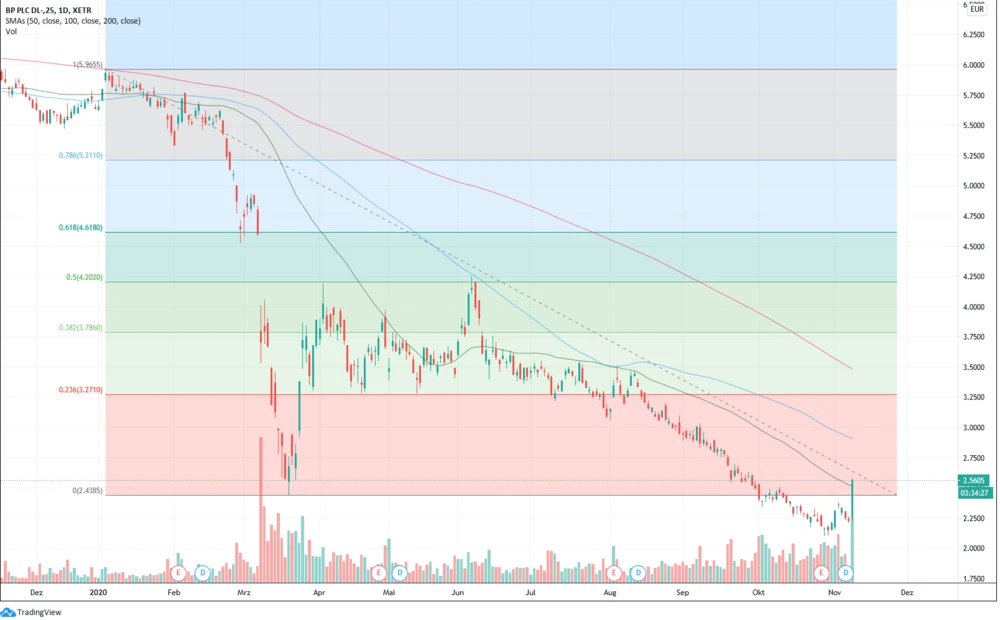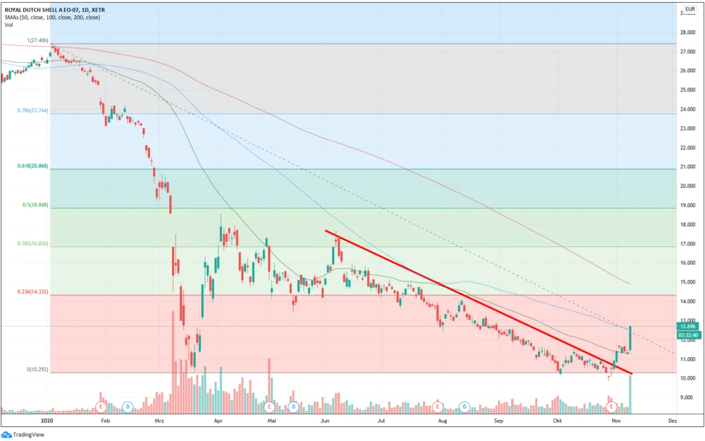 Soeben hat das Pharmaunternehmen BioNTech verkündet, dass es einen Antrag auf Zulassung für den Corona-Impfstoff stellen wird. Die Aktien der Ölproduzenten BP, Exxon und Royal Dutch Shell, die alle zuletzt auf Mehrjahrestiefs standen, erfahren nun einen wahren Aufschwung. Die Werte sind 10 bis 15 Prozent im Plus.