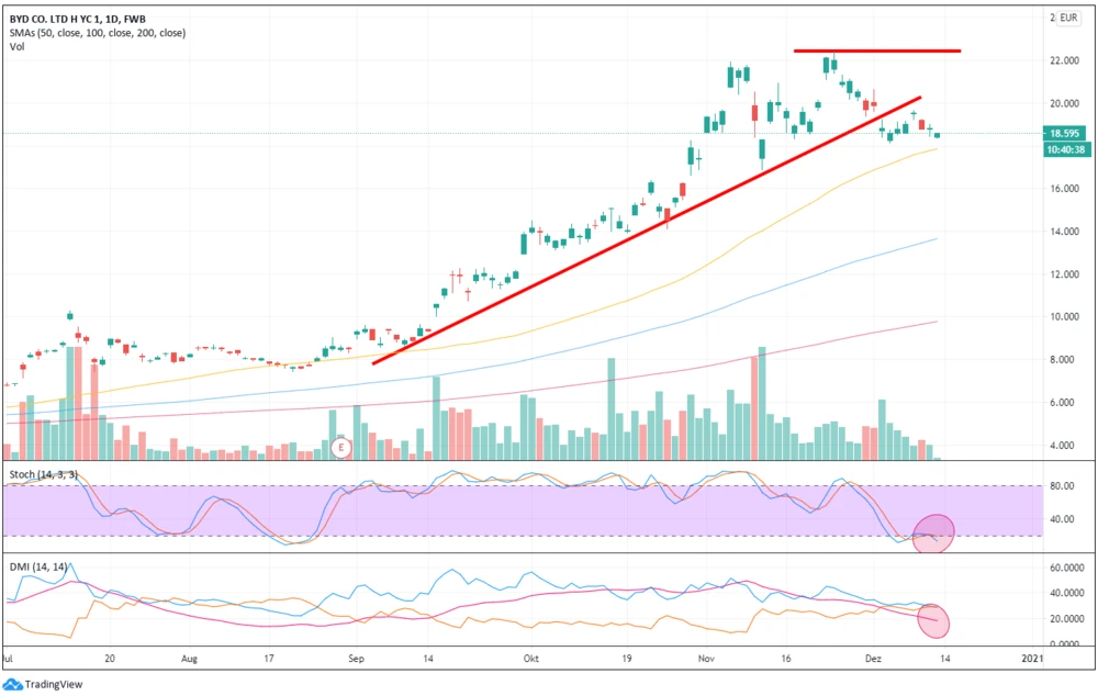 DER AKTIONÄR berichtete bereits letzte Woche, dass sich das Chartbild der BYD-Aktie eingetrübt hat. Der Kurs fiel dabei nach der Ankündigung einer Kapitalerhöhung unter die Trendlinie bei rund 19 Euro und generierte damit ein starkes Verkaufssignal.