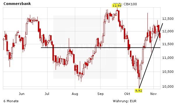 Der Höhenflug der Commerzbank-Aktie ist beendet. Die Aktie von Deutschlands zweitgrößter Bank ist am Montag unter den seit Mitte Oktober gültigen kurzfristigen Aufwärtstrend gerutscht. Normalerweise ist dies ein Verkaufssignal. Allerdings hat die Charttechnik bei der Commerzbank-Aktie in den vergangenen Monaten oft versagt. Zum Beispiel, als die Aktie im April mit dem Überwinden der 14-Euro-Marke ein glasklares Kaufsignal lieferte, dann aber mit Karacho auf 12,50 Euro fiel.