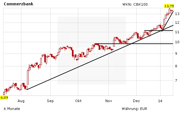 Sollte die steile Trendlinie allerdings nach unten durchbrochen werden, wäre dies auch noch längst kein Beinbruch. Schließlich verläuft bei knapp 11,70 Euro, der mittelfristige Aufwärtstrend. Bei 11,10 Euro und bei 9,90 Euro liegen indes zwei stärkere horizontale Unterstützungslinien. Es ist sehr unwahrscheinlich, dass all diese Supports innerhalb kurzer Zeit durchbrochen werden.