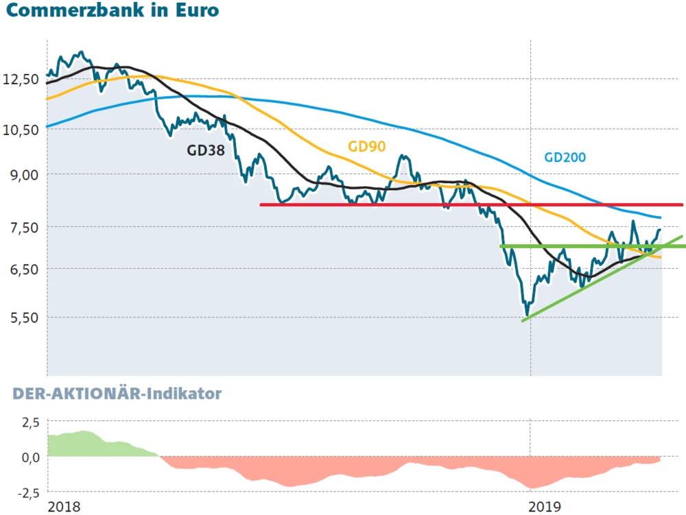 Knapp oberhalb dieser Marke – aktuell bei 7,74 Euro – verläuft zudem die 200-Tage-Linie. Diese hatte die Aktie im März 2018 gerissen und seitdem nicht wieder zurückerobern können. Gelingt nun der Sprung über die Trendlinie, wäre das eine Bestätigung der jüngsten Aufwärtsbewegung und ein klares technisches Kaufsignal. Das wiederum könnte den nötigen Schwung liefern, um den horizontalen Widerstand im Bereich von 8,00 Euro zur überwinden.
