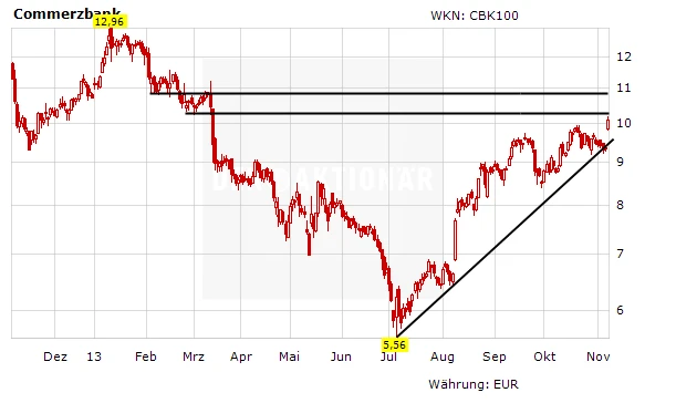 Noch vor wenigen tagen mussten die Anteilseigner der Commerzbank zittern. Denn an den vergangenen Handelstagen war der Aktienkurs kurzzeitig unter den seit Juli intakten Aufwärtstrend gerutscht. Nachdem die Frankfurter mit ihren Quartalszahlen den Markt jedoch positiv überraschen konnte, kennt die Aktie kein Halten mehr. Der DAX-Titel hat sich nicht nur wieder über die Aufwärtstrendlinie gehievt, sondern auch über die 10-Euro-Marke. Damit wäre die Commerzbank erstmals seit der Kapitalerhöhung im Frühjahr auch ohne den Resplit im Verhältnis 1:10 kein Penny-Stock mehr.