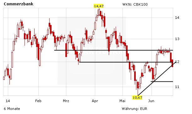Nach der Marke von 12,00 Euro hat die Commerzbank am Morgen auch die aufsteigende Trendlinie bei 11,89 Euro gebrochen. Damit müssen sich die Aktionäre von Deutschlands Bank Nummer 2 auf ungemütliche Tage einstellen, sollte nicht schleunigst ein Rebound erfolgen.